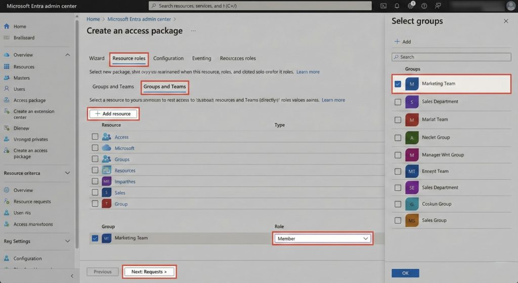 For each resource, you must select a specific Role (e.g., “Member” or “Owner”). This ensures users get the exact level of permission they need—no more, no less. The image below shows the process of adding a group and assigning a “Member” role to it.