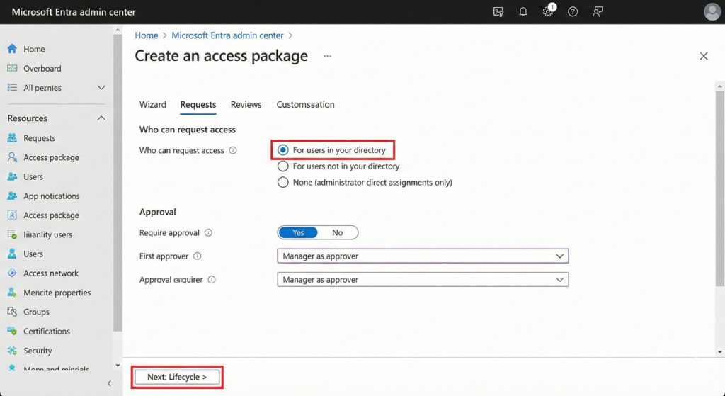 You can also set up Approval Settings (e.g., require manager approval) and Lifecycle Management (e.g., set access to expire after 90 days). The image below shows the configuration for allowing users in your directory to request access, with manager approval required.